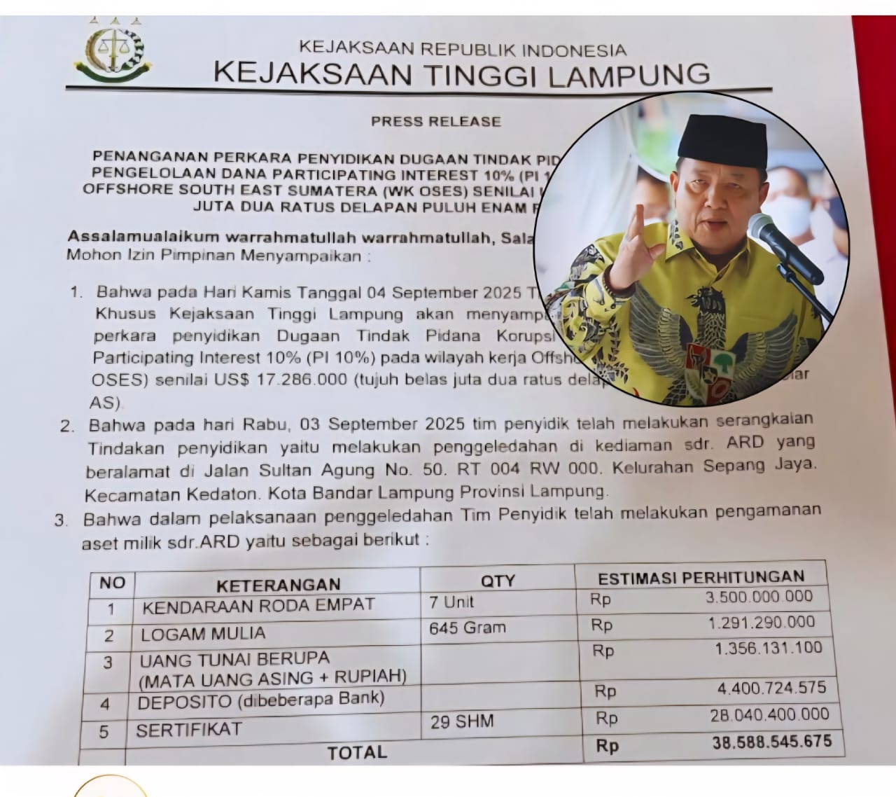 “Ases total yang kami sita mencapai Rp38.588.545.675,” tegas Asisten Pidana Khusus (Aspidsus) Kejati Lampung, Armen Wijaya, dalam konferensi pers Kamis (4/9/2025) malam.