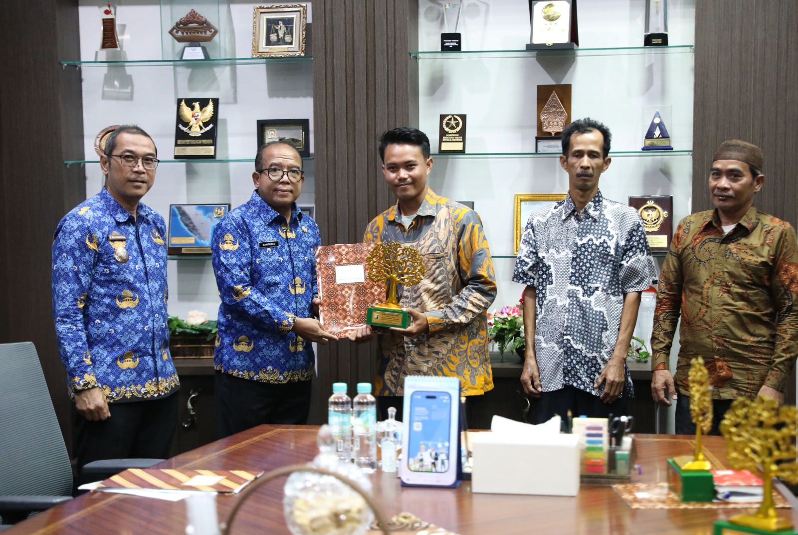 Pj. Gubernur Lampung Samsudin menyerahkan Penghargaan Pemenang Lomba Wana Lestari Tingkat Provinsi Lampung Tahun 2024 di Ruang Kerja Gubernur, Bandarlampung, Selasa (1/10/2024).