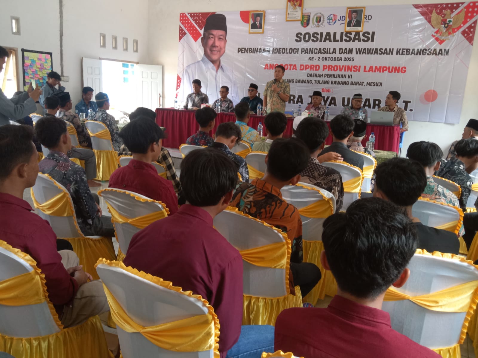 Tulangbawang – Di tengah derasnya perubahan pola perilaku pelajar akibat gempuran budaya digital, Anggota DPRD Provinsi Lampung Putra Jaya Umar memilih untuk tidak hanya bicara dari podium gedung dewan. Ia turun langsung ke ruang kelas, menggelar Sosialisasi Pembinaan Ideologi Pancasila dan Wawasan Kebangsaan di SMA IT Budi Luhur—Ponpes Al-Huda, Kampung Kekatung, Dente Teladas, Tulangbawang, kemarin (26/10).