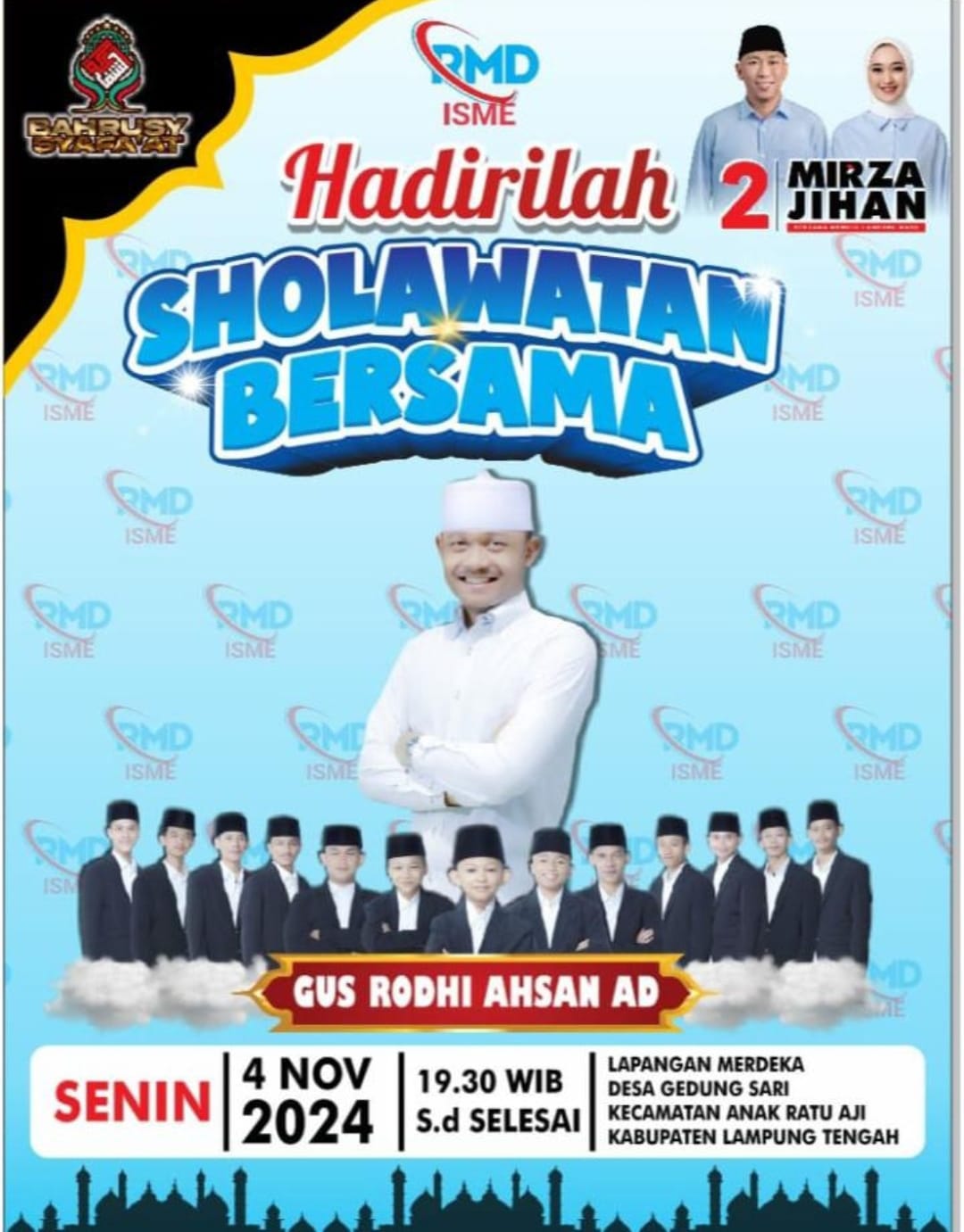 Relawan RMD (Rahmat Mirza Djausal) bersama Ikatan Siswa Muslim (ISME) akan mengadakan acara Sholawatan Akbar bersama masyarakat Kabupaten Lampung Tengah pada Senin malam, 4 November 2024, pukul 19.30 WIB.