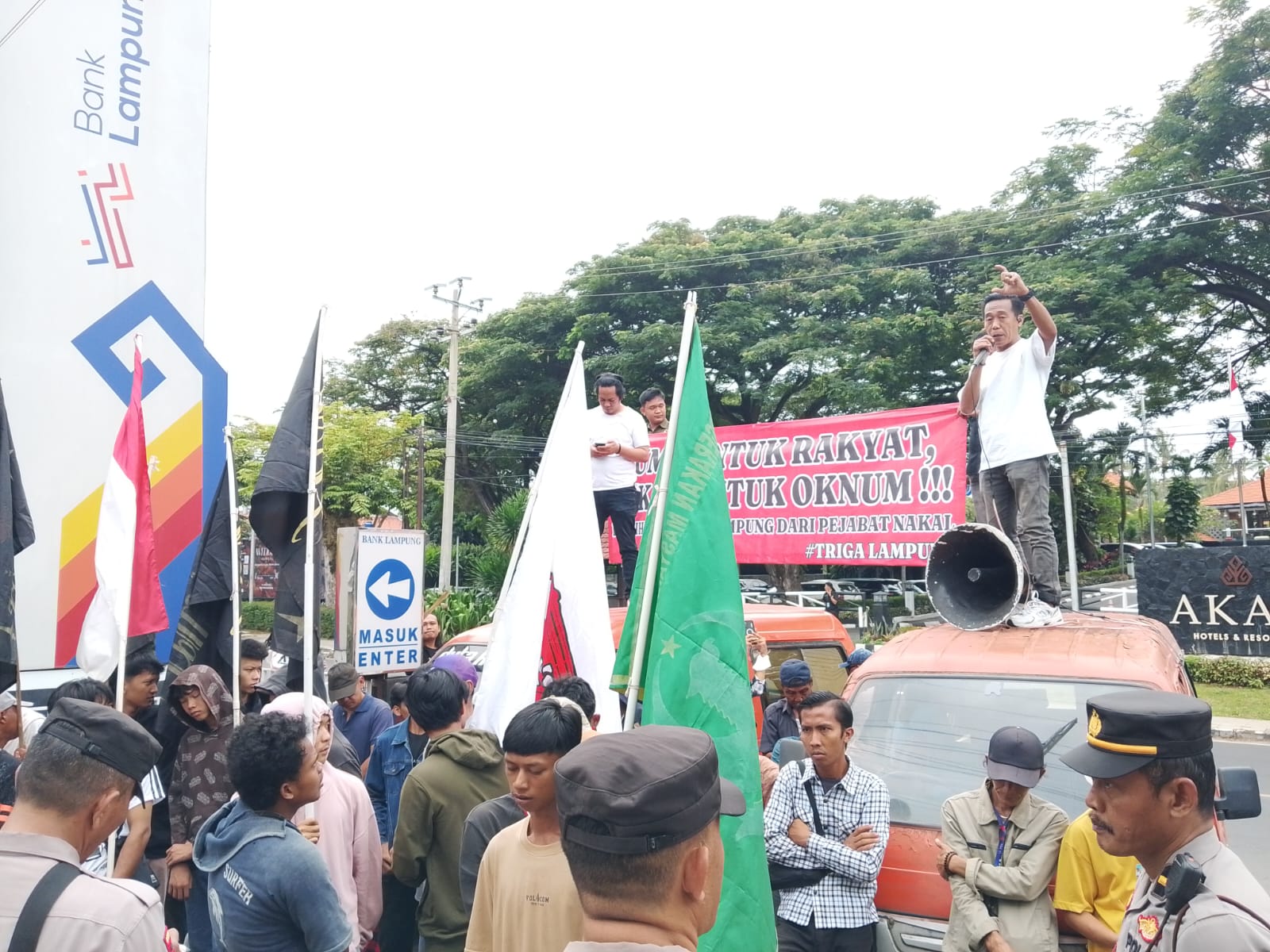 Bandar Lampung–Tiga organisasi sipil(Triga Lampung) , yakni Aliansi Komando Aksi Rakyat (AKAR), Koalisi Rakyat Madani (KERAMAT), dan Pergerakan Masyarakat Analisis Kebijakan (PEMATANK) menggelar aksi demo di depan kantor Bank Lampung pada kamis, (18/ 09/2025).