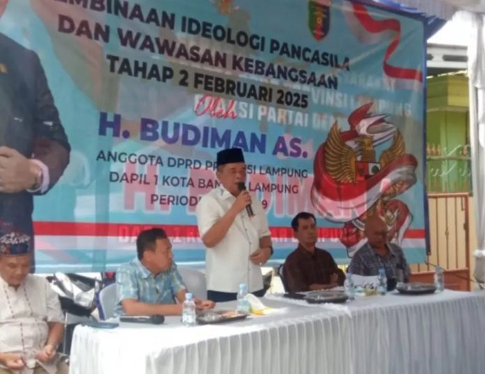 Anggota DPRD Provinsi Lampung Dapil Bandarlampung Budiman AS kembali turun ke masyarakat dalam rangka melangsungkan sosialisasi Pembinaan ideologi Pancasila dan Wawasan Kebangsaan di Kelurahan Sukarame, Kecamatan Sukarame, Sabtu (15/2).